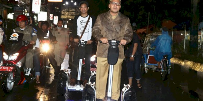 MAKASSARMETRO– Wali Kota Makassar Moh. Ramdhan ‘Danny’ Pomanto berkeliling menggunakan Run Wheel sebelum puncak peringatan malam pergantian tahun 2016-2017 di sepanjang pantai losari, Makassar, (31/12).