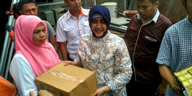 MAKASSARMETRO– Ketua Tim Penggerak Pembinaan Kesejahteraan Keluarga (TP PKK) Kota Makassar, Indira Yusuf Ismail menyerahkan bantuan kepada korban anging puting beliung di jalan Sultan Abdullah Raya, minggu (12/2).
