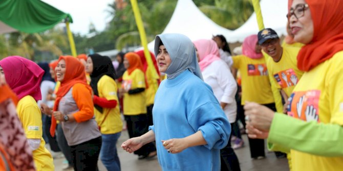 MAKASSARMETRO– Ketua TP PKK Kota Makassar Indira Yusuf Ismail senam bersama warga di Anjungan Pantai Losari, minggu (19/2/2017), Senam yang di gelar Kalbe Farma dan Indonesia Cancer Care Community ini bertema Let’s Against Cancer.