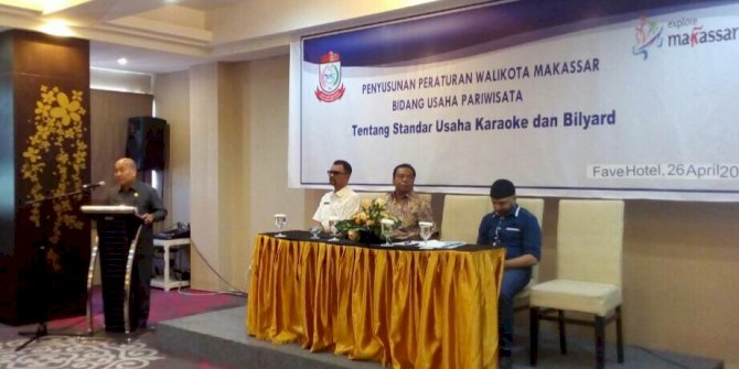 MAKASSARMETRO– Dinas Pariwisata (Dispar) Kota Makassar menggelar Penyusunan Peraturan Walikota (Perwali) Makassar tentang Penerapan Standar Usaha Karaoke dan Rumah Bilyar di Hotel Fave, jln. Pelita Raya. Rabu (26/4/2017).