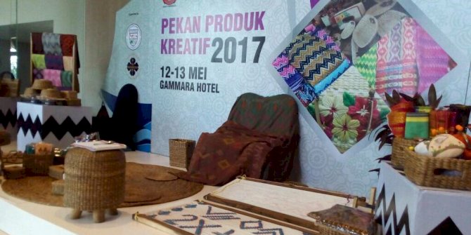 Tampak pada display booth Dispar Makassar menampilkan sejumlah produk seperti bumbu tradisional kemasan, kain tenun, baju batik aksara lontara, dompet serta beberapa kerajinan tangan berbahan eceng gondok yang merupakan hasil binaan Dekranasda Makassar.