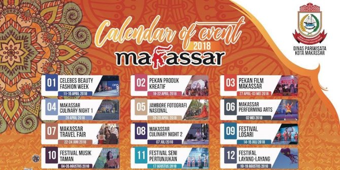 Berdasarkan Kalender Monthly Event 2018 yang dirilis Dinas Pariwisata Kota Makassar di awal tahun ini, masih ada hampir dua puluh event wisata yang tidak kalah menariknya. Ini daftar event mulai Juli hingga Agustus.
