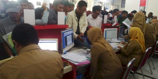 MAKASSARMETRO– Warga kota Makassar memadati kantor Dinas Kependudukan dan Pencatatan Sipil (Disdukcapil) di Jalan Teduh Bersinar, Kecamatan Rappocini. Senin (7/1/2019).