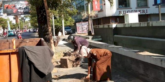 Sampah yang berada di jalan maupun di saluran air diangkut. Pot bunga yang nampak kusam juga dibersihkan berikut tanamannya yang sudah mengering.