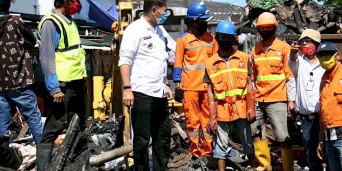Andi Unru bersama Kasiber, Pengawas Kebersihan dan Satgas Kebersihan bahu membahu melakukan pengerukan puing-puing sisa kebakaran yang terjadi beberapa waktu lalu.