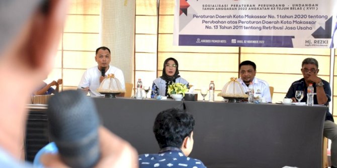 Sosialisasi Peraturan Daerah (Perda) Nomor 1 Tahun 2022 tentang Perubahan atas Perda Nomor 13 Tahun 2011 tentang Retribusi Jasa Usaha, di Hotel Karebosi Premier, Jalan Jenderal M. Jusuf, Rabu (2/11/2022). MAKASSARMETRO, MAKASSAR – Anggota DPRD Kota Makassar, Rezki, menggelar sosialisasi Peraturan Daerah (Perda) Nomor 1 Tahun 2022 tentang Perubahan atas Perda Nomor 13 Tahun 2011 tentang Retribusi Jasa Usaha, di Hotel Karebosi Premier, Jalan Jenderal M. Jusuf, Rabu (2/11/2022).